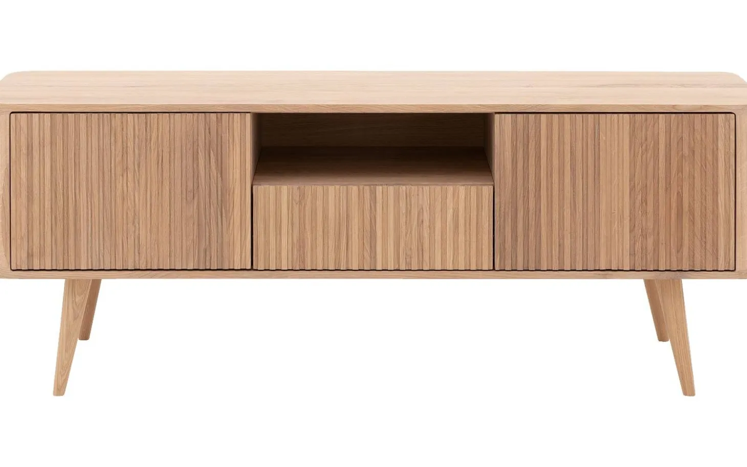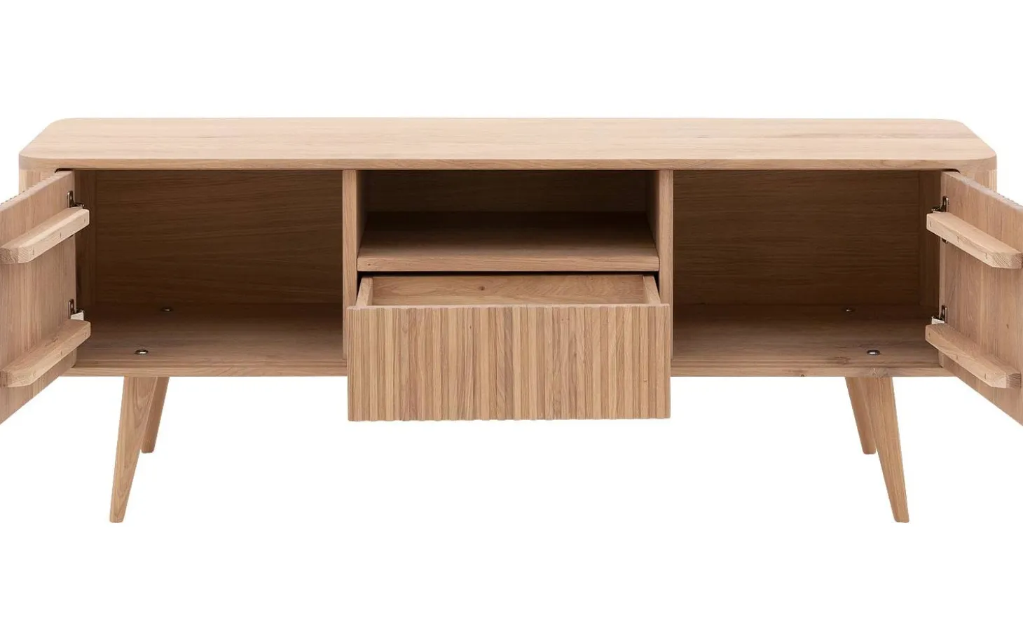 TV-Möbel Seppe strahlt pure skandinavische Wärme aus durch das nachhaltige Eichenholz mit weißer Öl-Oberfläche. Die runde Formgebung verleiht einen Retro-Touch, der perfekt zu sowohl modernen als auch klassischen Einrichtungen passt. Dieses eichene TV-Möbel behält seinen natürlichen Holzcharakter durch die Ölschicht, die es vor Flecken schützt.