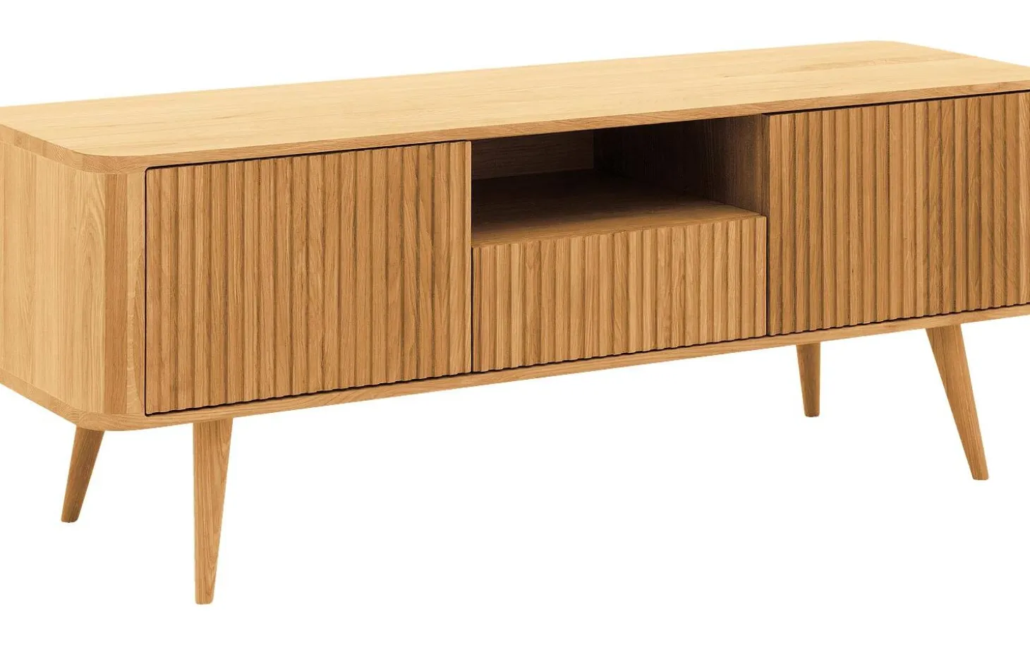 TV-Möbel Seppe bringt skandinavische Ruhe in Ihr Wohnzimmer. Das Retro-Design mit warmer Eichenverarbeitung sorgt für eine natürliche, gemütliche Atmosphäre. Mit praktischem Push-to-Open-System, praktischer Schublade und geräumigem offenem Fach für all Ihre Geräte. Perfekt für ein stilvolles und aufgeräumtes Wohnzimmer.