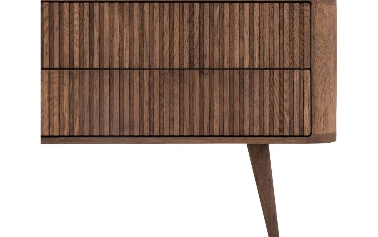 TV-Möbel Seppe strahlt Wärme und Natürlichkeit aus dank des hochwertigen Eichenholzes mit Soft-Touch-Lack in Nussfarbe. Die runde Formgebung verleiht diesem stehenden TV-Möbel eine stilvolle Retro-Ausstrahlung, die perfekt zum skandinavischen Wohntrend passt. Ein echter Blickfang, der Ruhe in Ihr Interieur bringt.