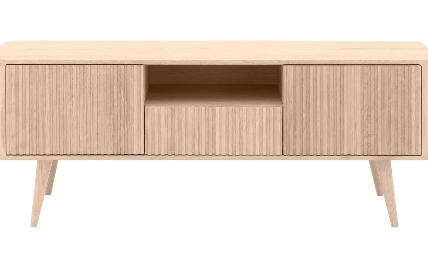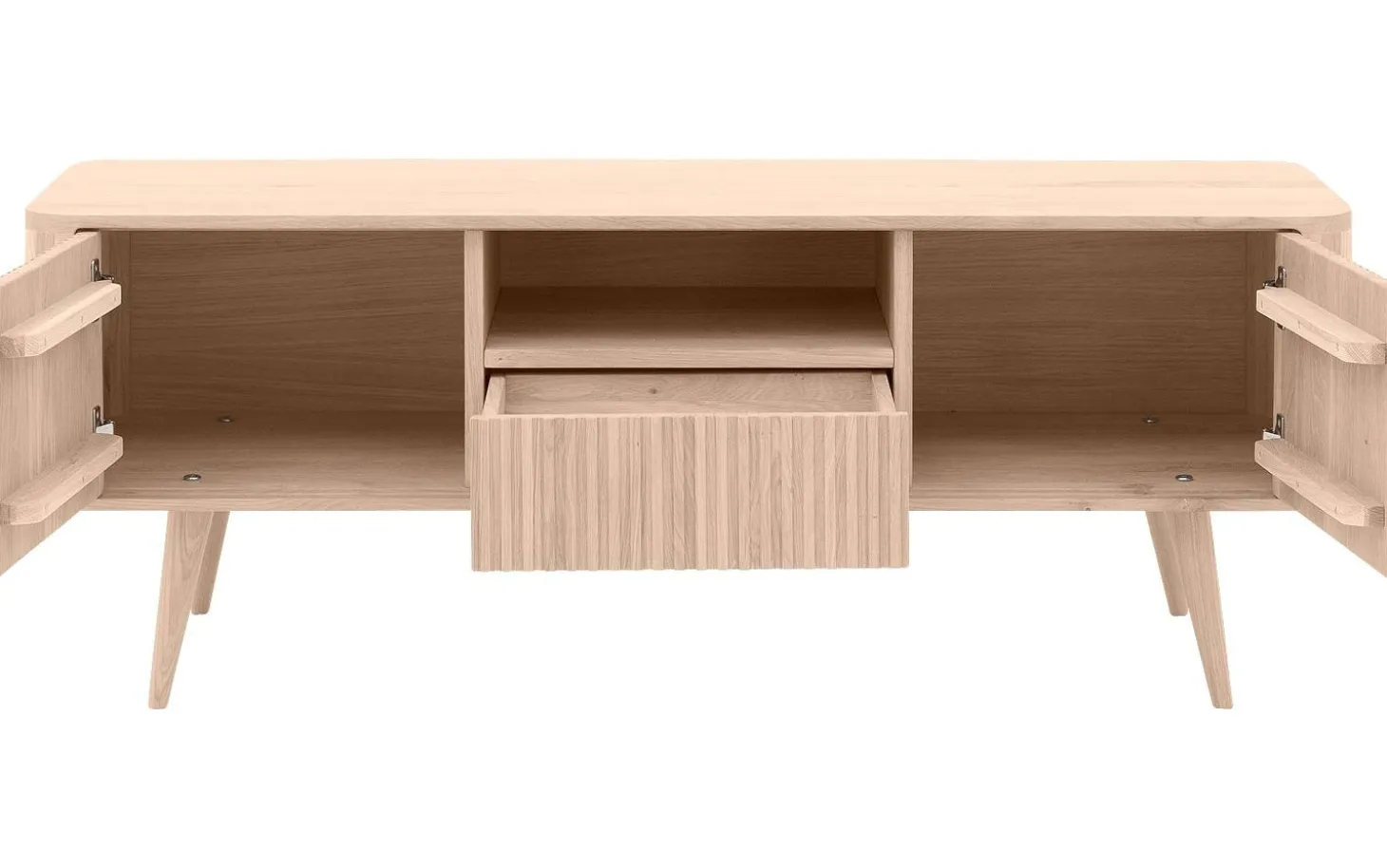 Das offene Mittelfach (41 x 13 x 40 cm) ist perfekt für Ihren Receiver oder Ihre Soundbar, während die geräumige Schublade (37 x 8 x 31 cm) Fernbedienungen und Kabel ordentlich verstaut. Die geschlossenen Fächer (43 x 26 x 39 cm) bieten zusätzlichen Stauraum für alles, was Sie aus dem Blickfeld haben möchten.