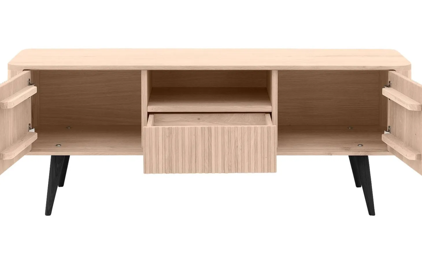 Mit seiner cleveren Aufteilung bietet Seppe Platz für alles: das offene Fach (41 x 13 x 40 cm) für Ihren TV-Receiver, zwei geschlossene Fächer (43 x 26 x 39 cm) für Geräte und eine handliche Schublade (37 x 8 x 31 cm) für Fernbedienungen und Kabel. Kombinieren Sie es mit anderen Möbeln aus derselben Serie für ein komplettes Ensemble.