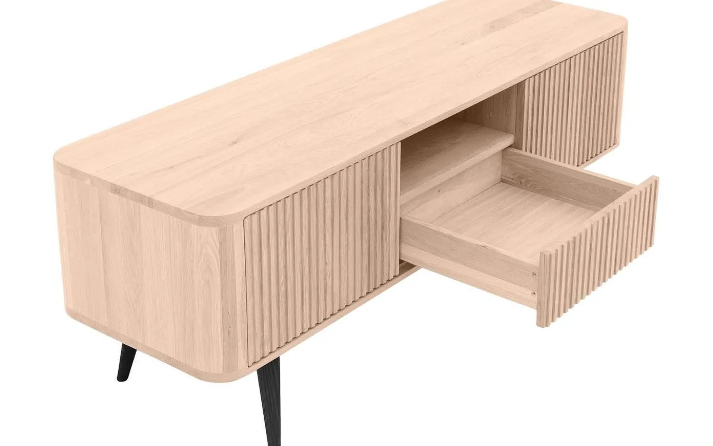 TV-Möbel Seppe bringt die warme skandinavische Atmosphäre direkt in Ihr Wohnzimmer. Das Retro-Design in Eiche mit cremefarbener Lackierung kombiniert natürliche Ausstrahlung mit praktischem Stauraum. Das clevere Push-to-Open-System sorgt für klare Linien ohne Griffe, während die verschiedenen Fächer Platz für all Ihre Geräte und Accessoires bieten.