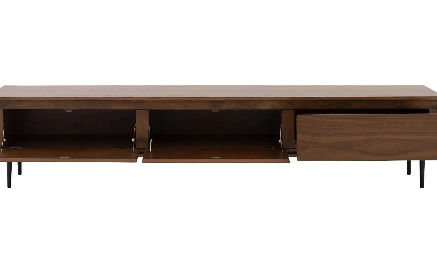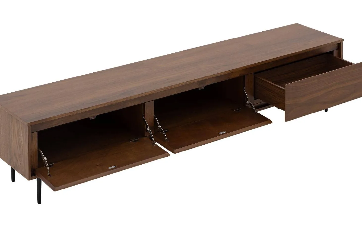 TV-Möbel Trani kombiniert warmes braunes Eschenholz mit einem klaren modernen Design. Die praktischen Soft-Close-Türchen und die Schublade sorgen für geräuschlose Nutzung, während das breite Format von 208 cm reichlich Platz für große Fernseher bietet. Eine zeitlose Wahl, die Wärme und Funktionalität perfekt kombiniert.