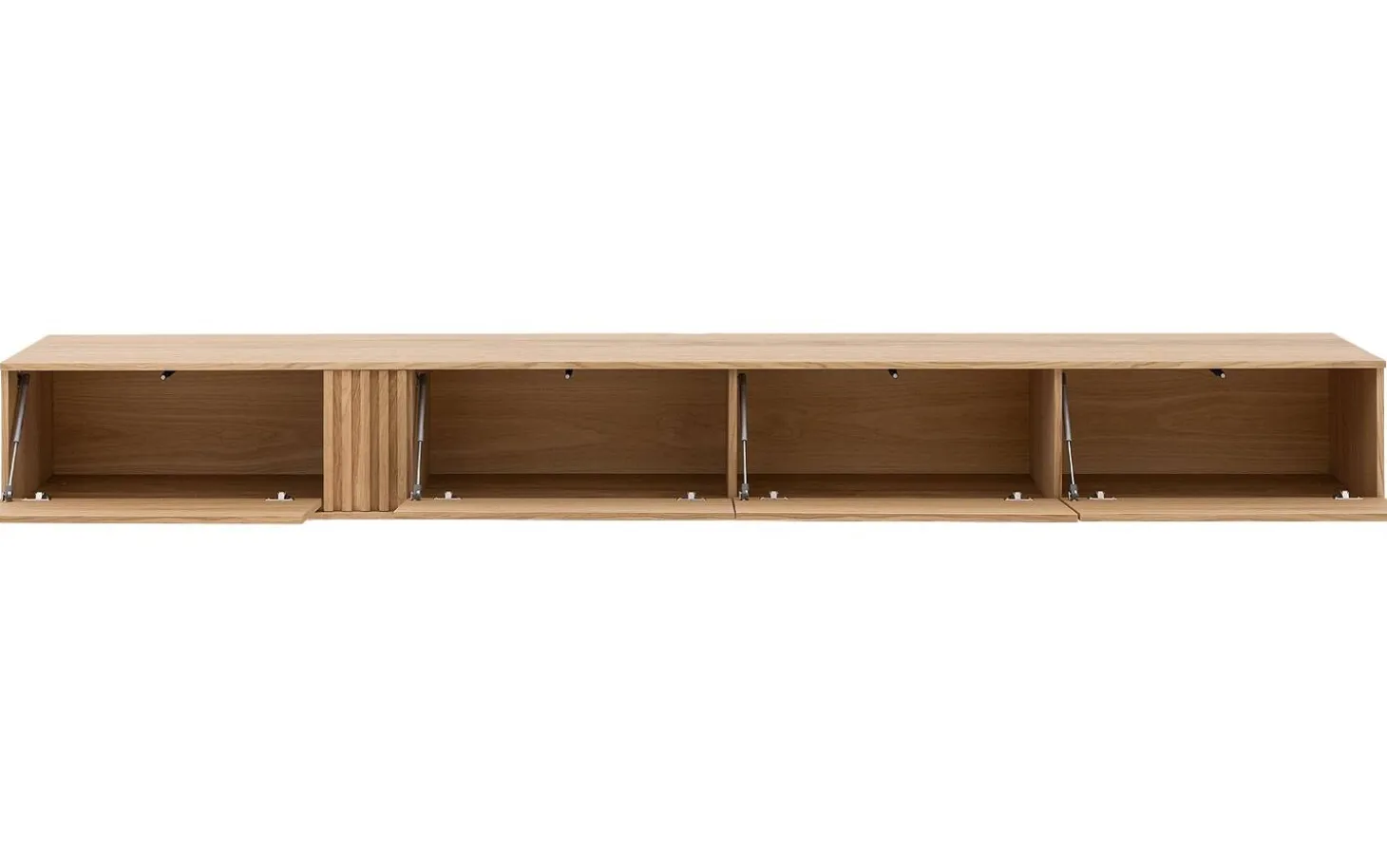 Die vier Klappentüren des TV-Möbels Viola öffnen sich leicht mit einem sanften Druck dank des Push-to-Open-Systems. So erhalten Sie die klaren Linien ohne sichtbare Griffe. Das Eichenfurnier mit Soft-Touch-Lack ist weniger anfällig für Holzarbeitung und bleibt lange schön.