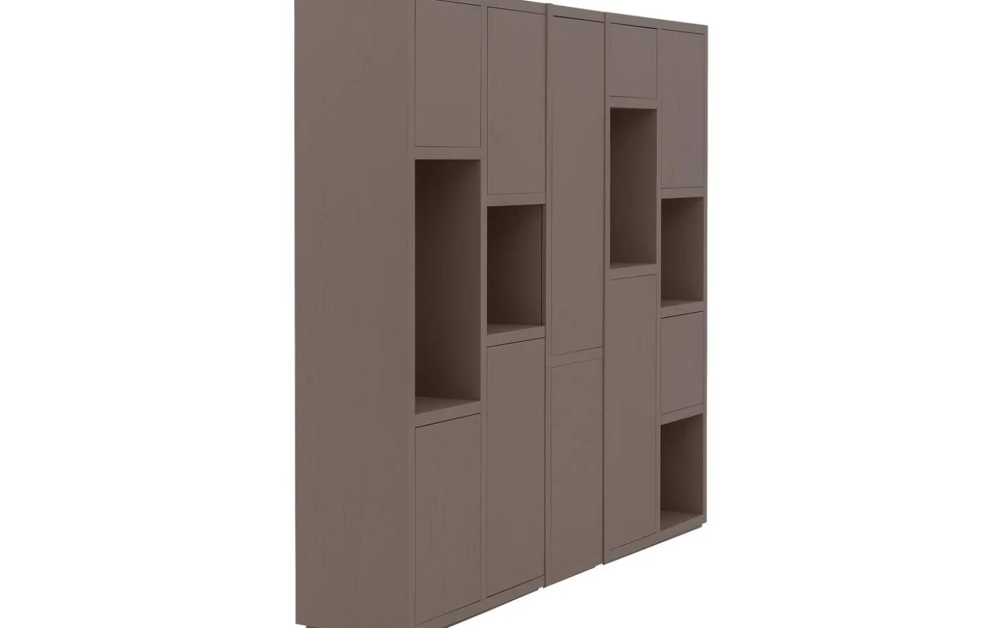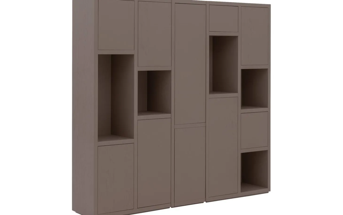 Dit bruine eiken wandmeubel maakt indruk door zijn royale formaat en verfijnde taupe laklaag. De warme houtkleur zorgt voor een natuurlijk karakter, terwijl de strakke lijnen een moderne touch geven. Open vakken en gesloten opbergvakken wisselen elkaar mooi af voor een speels effect.
