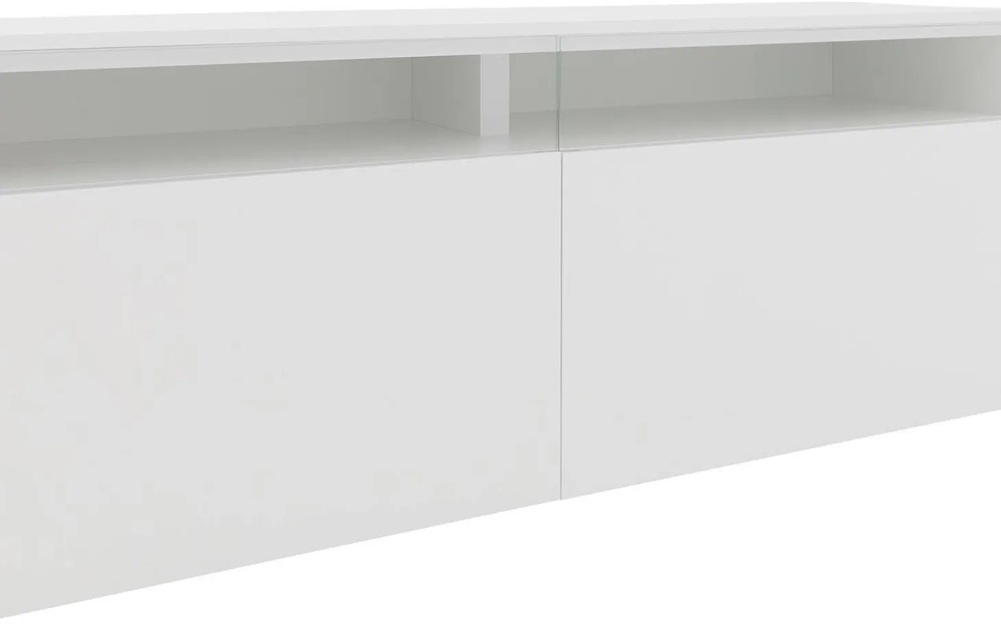 Der weiße Seidenglanslack des Wandmöbels Monza sorgt für eine klare, moderne Ausstrahlung, bei der die Holzstruktur vollständig verschwunden ist. Diese mehrschichtige Verarbeitung bietet ausgezeichneten Schutz vor täglichen Einflüssen. Die vier Türen und die Klappe funktionieren mit einem praktischen Push-to-Open-System für einen cleanen Look.