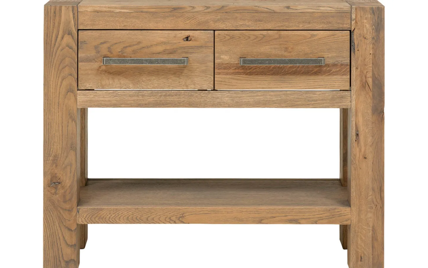 Die quadratischen Beine laufen durch die Platte hindurch, was für zusätzliche Stabilität und eine kraftvolle Formgebung sorgt. Die praktische Schublade bietet nützlichen Stauraum und hält die Platte frei für Dekoration.